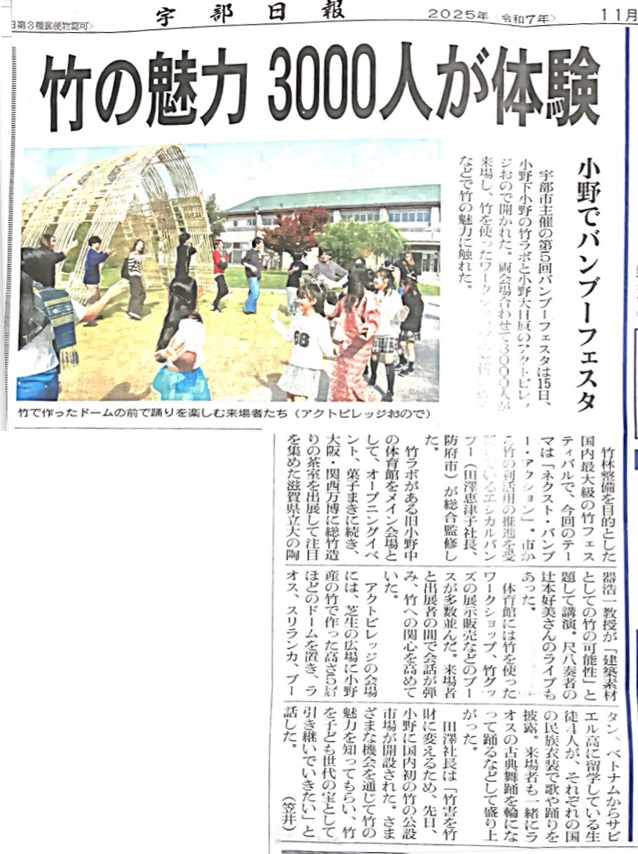 弊社が総合監修を行なった宇部市主催、山口県後援のバンブーフェスタ@うべが紹介されました。本イベントは竹林整備を目的とした日本最大級の竹フェスティバルで、今年は第5回の開催となり3,000人以上の方にご来場いただきました。