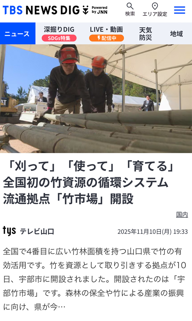 『「刈って」「使って」「育てる」全国初の竹資源の循環システム 流通拠点「竹市場」開設』として竹を資源として取り引きする拠点が10日、宇部市に開設されたことが取り上げられました。